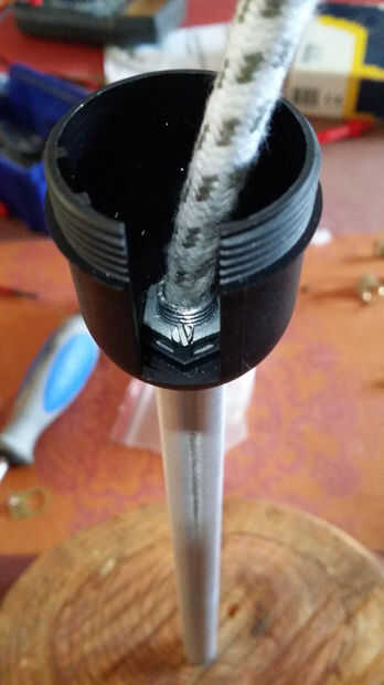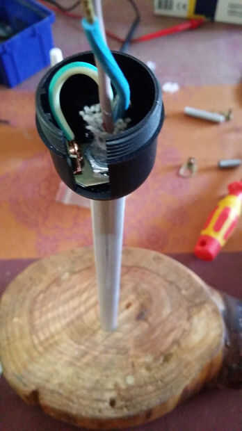 1. Pase el cable por el tubo roscado, la base, el tubo de aluminio, el segundo tubo roscado y el zócalo del bulbo. Dejar 5 a 8 cm de cable sobre el tubo para conectar la toma de corriente.
