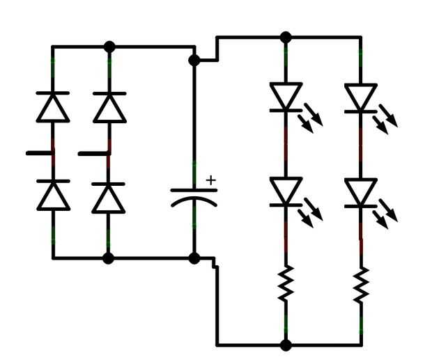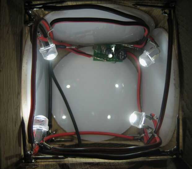 El voltaje de la fuente es v 12. Cada cubo tiene cuatro LEDs de 0.5 vatios dentro. Para los LEDs en cada cubo, hice un circuito que contiene los siguientes componentes: puente rectificador, un 6,8 Uf del condensador y dos resistencias de 1w de 39 ohmios. Esquemas se muestran en la imagen de arriba.