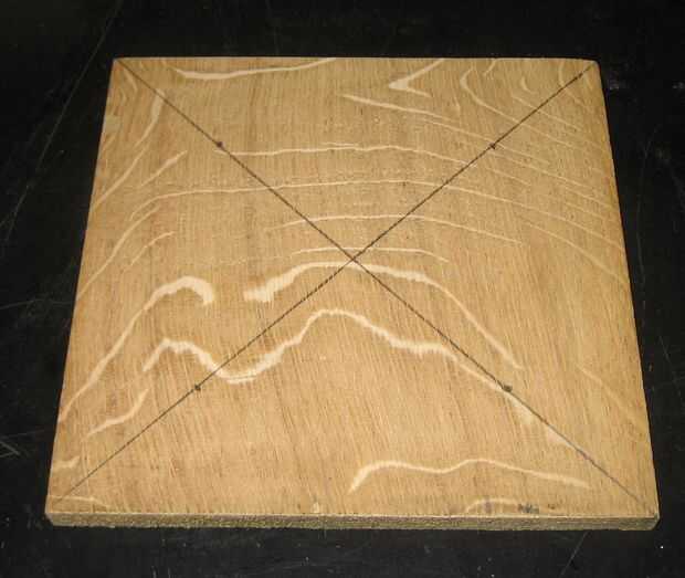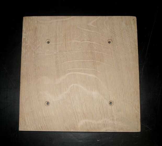 Dibujar una cruz en lo restantes 14 cm por pieza de 14 cm (parte superior) y hacer una marca de 4 cm desde cada esquina. Taladre un agujero de 3 mm en cada marca y perfore un 6 mm agujero 3 mm profundo encima de eso.