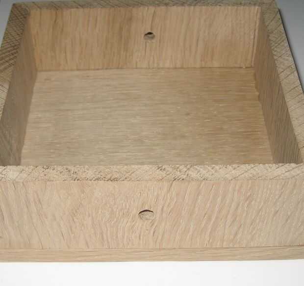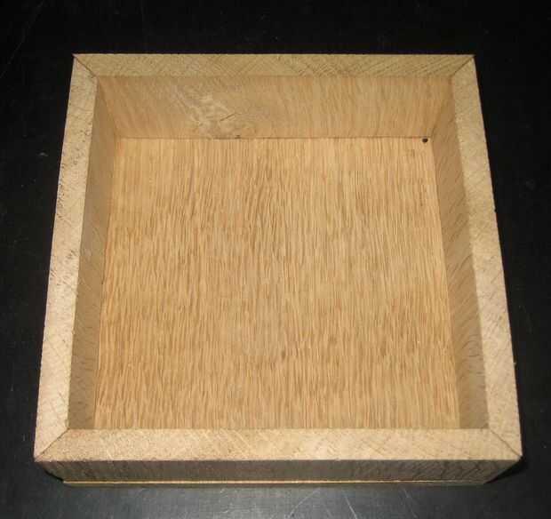 Sierra cuatro 14 cm con piezas de 4 cm de la madera. Vio una esquina de 45 grados del lado corto de cada pieza. Pegar estas piezas juntas en la parte superior un 14 cm por 14 cm para crear un cuadro, dejando la tapa a un lado por el momento.