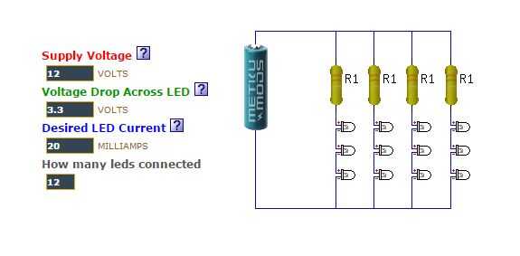 Ya que cada color LED tiene un voltaje diferente (yo usé blanco y azul) y puede usar una tensión de alimentación diferente necesita hacer su propio cálculo basado en su situación. Es de gran ayuda calculadora de LED.