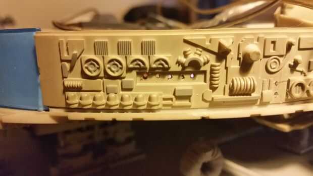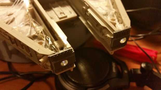 Hice lo mismo para los reflectores en el frente de la nave. Taladré un agujero ligeramente mayor y hotglued el LED en su lugar.