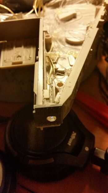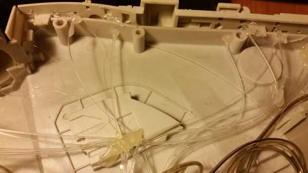Empecé a perforar los agujeros de 1mm en el fuselaje en los lugares que necesitan las pequeñas luces. Traté de agrupar algunas luces juntos en patrones que se veía bien en el barco. Terminé muy pocos agujeros. Que hecho pegué las fibras ópticas en el exterior. He dejado 1cm fuera, luego le corté estas longitudes adicionales de. En el interior he dejado suficiente longitud para trabajar con en el siguiente paso. Entonces me puse un poco de pegamento caliente para fijar las fibras en su lugar.