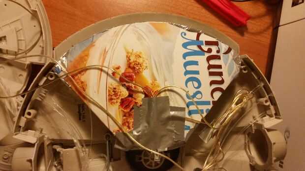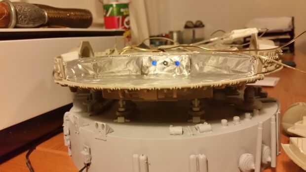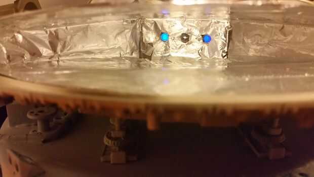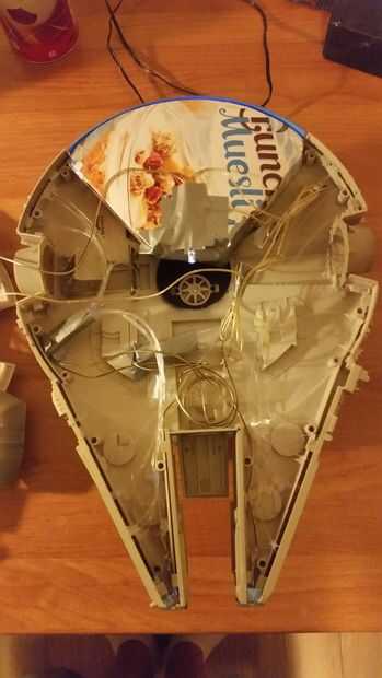 Finalmente cableado todos los LEDs y transistores y testen todo. El interior de la nave parecía espagueti pero funciono muy bien! Para asegurarse de que los LEDs iluminar las fibras ópticas no derramará luz pegado les con cinta adhesiva.