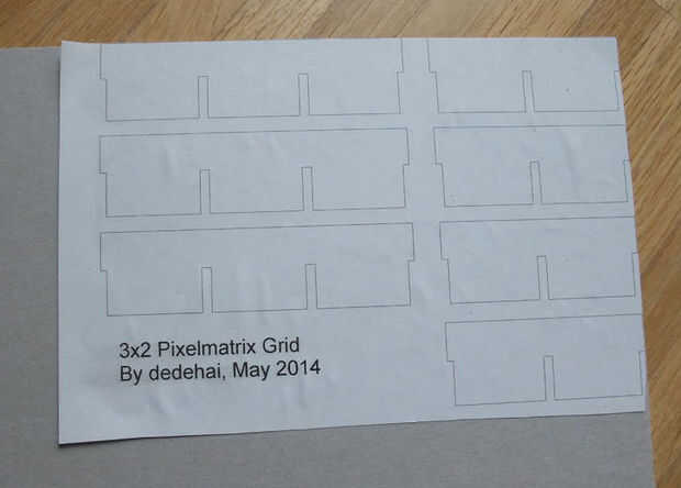 Utiliza la distribución adjunta, imprimirla (unscaled a papel A4) y pégala a la cartulina. Corte a lo largo de las líneas que los recortes tan anchos como el espesor de la cartulina. Como dibujado, son 3mm de ancho. Si los huecos son demasiado grandes, la luz puede pasar a través de la red. Juntar las piezas y use pegamento para fijarlo. Una banda elástica o cinta de algunos puede impedir que cayendo a pedazos mientras el pegamento seca. Importante: un lado de la rejilla debe ser plana. Es la parte que irá contra el vidrio. La parte trasera puede tener algunas alturas desiguales, no hará ninguna diferencia en el final.