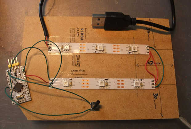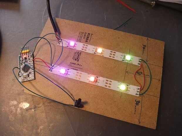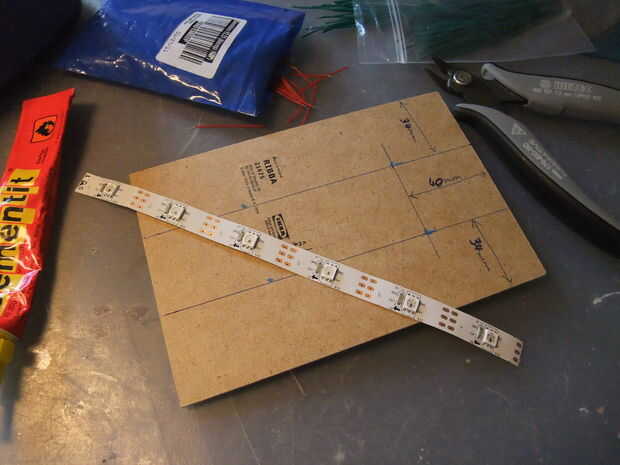 Cortar la tira de LED en dos partes de tres LEDs. He utilizado transparente doble cara para pegar cinta en normal o pegamento también obras, no te muy calientes, así que no te preocupes cinta de fusión. Mis tiras tienen flechas, marca el camino que la señal atraviesa la tira. Hice la entrada en la parte inferior izquierda para que las flechas son de izquierda a derecha en la franja inferior y de derecha a izquierda en la parte superior uno.