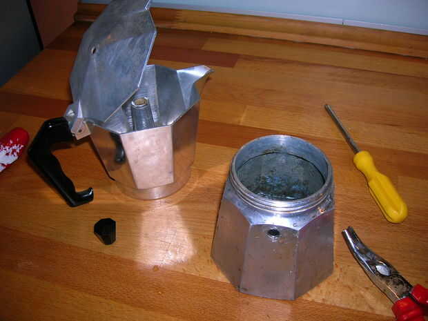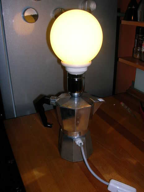 La Bialetti está hecho de aluminio, por lo que es fácil de modificar, si es necesario. Al final sólo debían presentar un poco en la tapa de la lámpara bombilla de la casa.