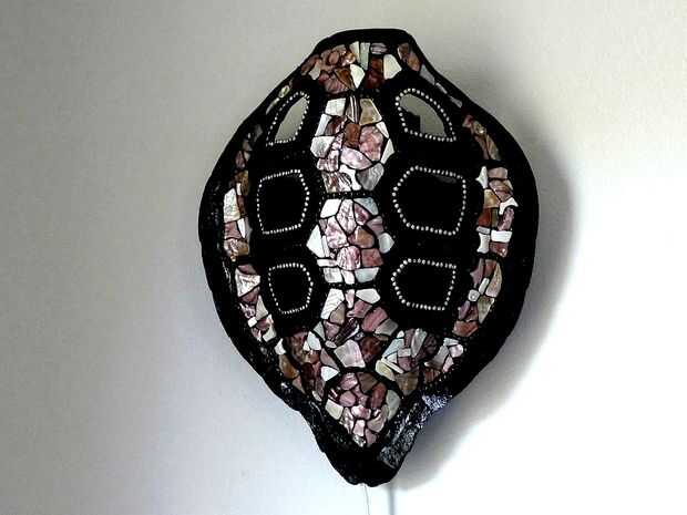 En una de nuestras caminatas, descubrimos un caparazón de tortuga ancianos, resistida lavada en tierra. Me encantó su forma natural y decidió darle nueva vida como un aplique de pared para nuestra casita en Baja.