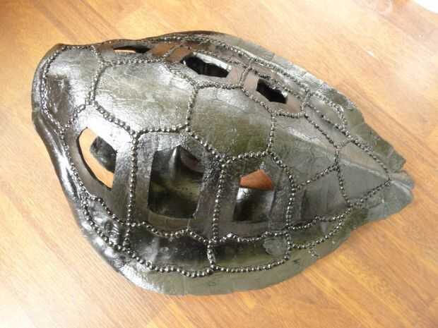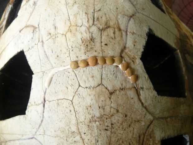 Me llamó gotas de pegamento para madera gorila (cosas difíciles!) a lo largo de las líneas previamente marcadas luego aplicar firmemente las lentejas uno... por... uno. Una vez terminó el contorno de la lenteja y el pegamento estaba secado, la cáscara de la tortuga tiene una capa completa de pintura en aerosol negro.