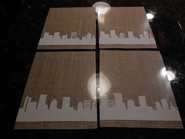Cortar las piezas de laminado de paisaje urbano y usar cinta de doble cara para fijar la hojas de arpillera.