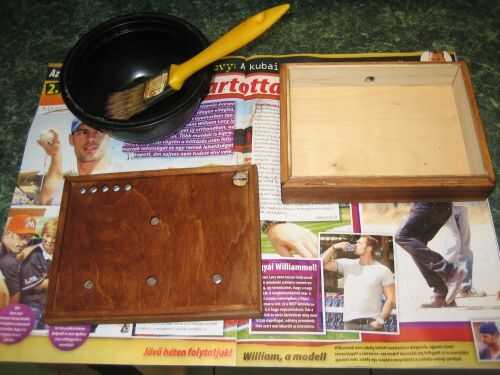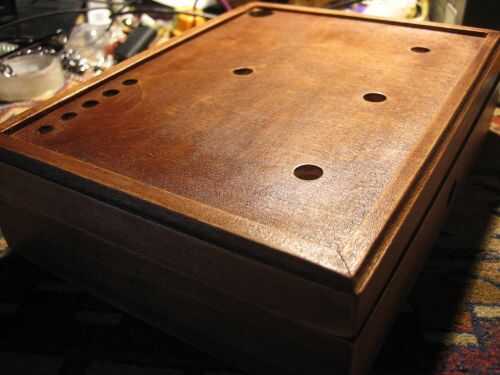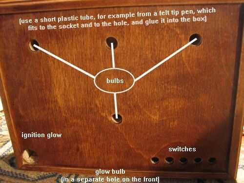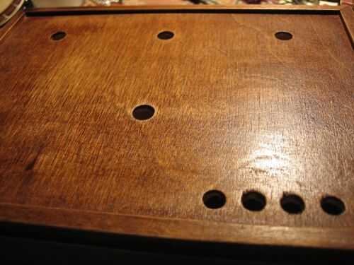 Los trabajos de madera: después de lijar y barnizar primero. Aquí están los agujeros con el nombre de las partes correspondientes, pero don'thave a seguir esto, acaba de encontrar cierta alineación de las piezas dependiendo de su tamaño o cualquier otra cosa. Si usted aleatorizar los interruptores o bombillas, la operación será más interesante y laberíntico.