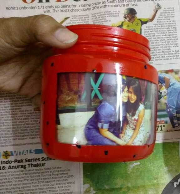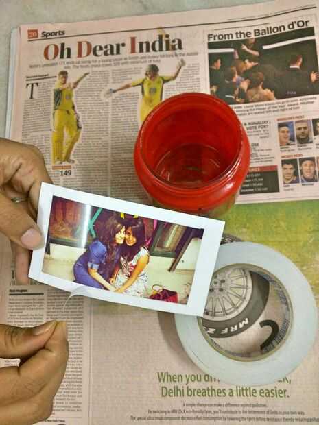 Mida su 'ventana' e imprimir su foto favorita después de cambiar el tamaño para caber esto. Doble cinta su foto por todos lados (como se muestra en la foto) y pegarlo desde el interior con la ventana que ha creado.