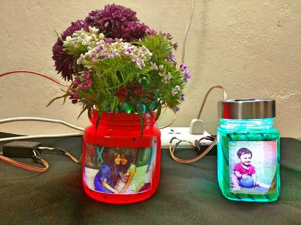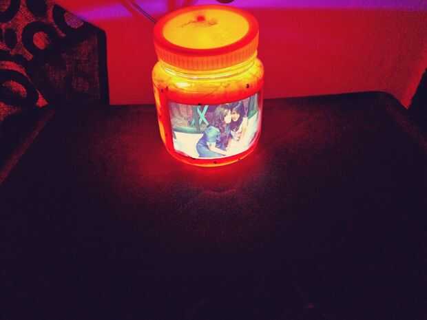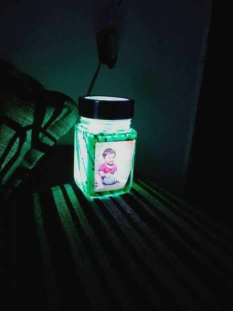 Hice dos de estos - el funciona como una luz nocturna sólo y el más grande, un jarrón de foto luminaria. Para la jarra más grande, pongo en un vaso desechable dentro del frasco para el agua y flores frescas.