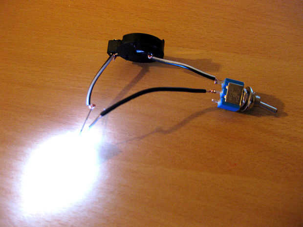 El LED que estoy usando es un LED de 10mm en 3v. Puesto que la pila de botón (CR2032) da 3v no hay necesidad de cambiar nada. Sólo conectar el LED a la batería será suficiente iluminar.