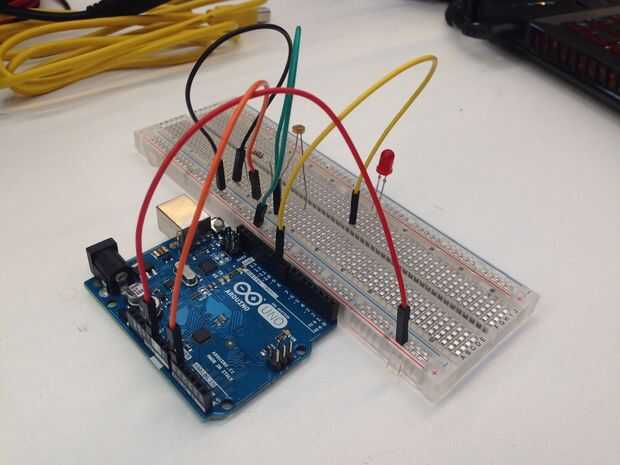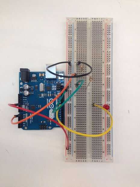 Añadir el LED a la placa y conectar su "mayor, positivo" a tu Arduino. Asegúrese de que está conectado a un pin digital (en nuestro caso 9).