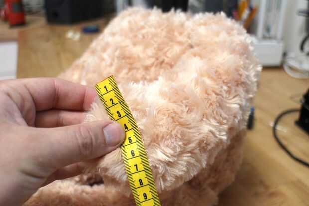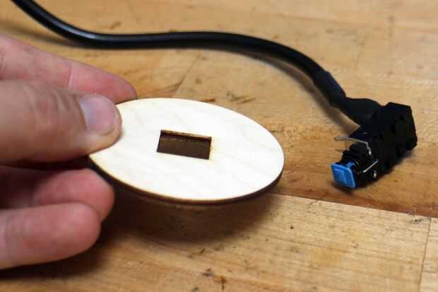 El diseño es una forma de disco de madera contrachapada que se sujete el interruptor dentro de la pata y siempre orientado hacia arriba. Para ello medí el diámetro aproximado de la pata de oso de peluche y luego las dimensiones exactas del interruptor eléctrico. Transferir las medidas a un pedazo de madera contrachapada fina y luego recortar. Puesto que este tubo de madera contrachapada se esconde el oso que no se ven muy bien, pero que necesita tener los bordes lisos para no conseguir enredarse en cualquier tela durante la instalación.