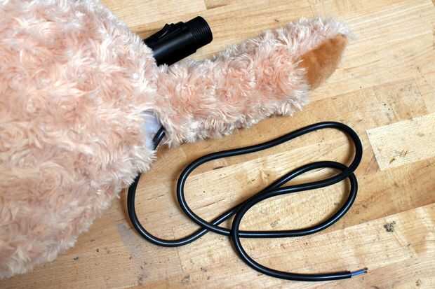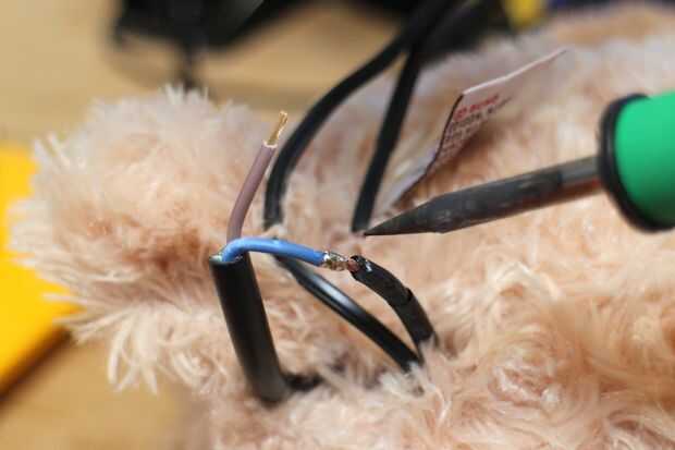 Las conexiones soldadas y envuelta se rellena dentro del oso, entonces la abertura de la parte inferior era cierre cosido para que sólo el cable eléctrico quedó colgando hacia fuera.