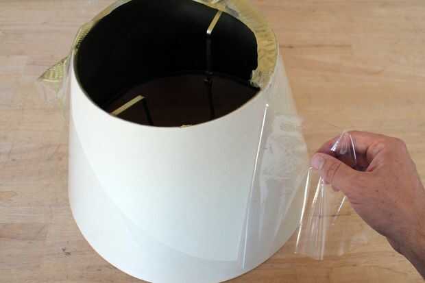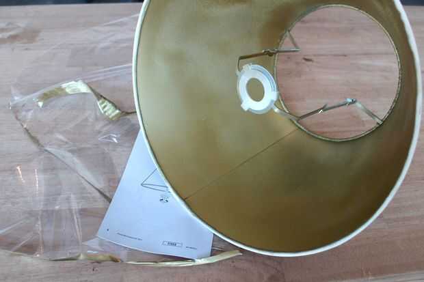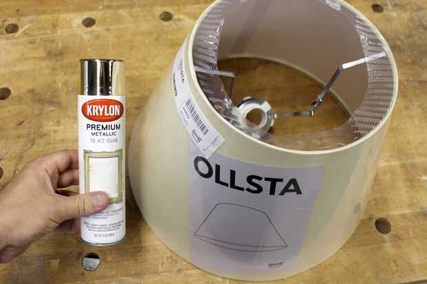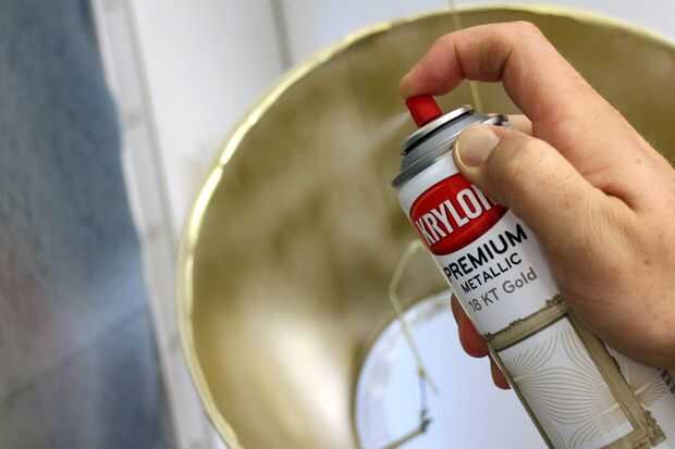 Puesto que la pantalla viene envuelta en plástico para proteger el exterior de la tela decidí dejar en durante la pintura del interior. Utilicé una pintura en aerosol oro metálica brillante y aplica unas capas para asegurar una buena cobertura.