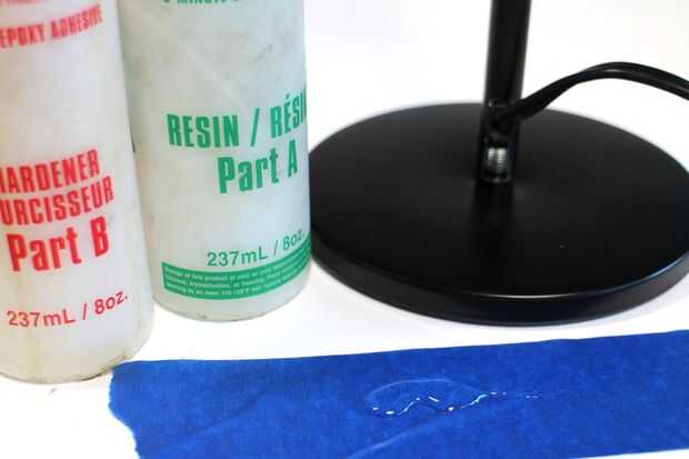 Sujeta suavemente el extremo cortado del eje de la cerca hasta el canal de corte y ajuste alrededor de la base roscada. Después de mezclar algunas epoxi de parte 2 cuidadosamente de rosca del eje de la lámpara acortado en la base con un uso liberal de epoxy, asegurada el eje fue el nivel de la base y luego permitió el epoxi curar durante la noche.