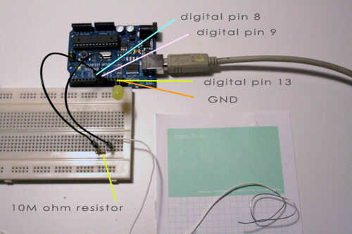 4. el mismo alambre que se va a la entrada 9 Conecte un trozo de alambre que se desnuda en una de ella es los extremos. Este cable es nuestro sensor, y será finalmente sustituido, en nuestra lámpara de hilo conductor