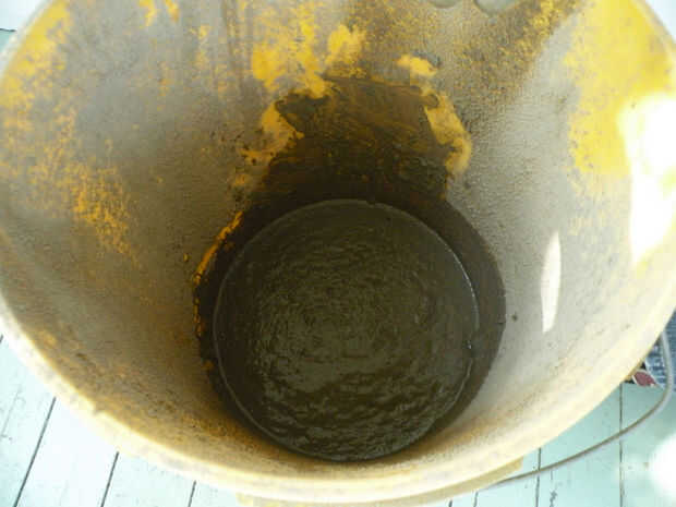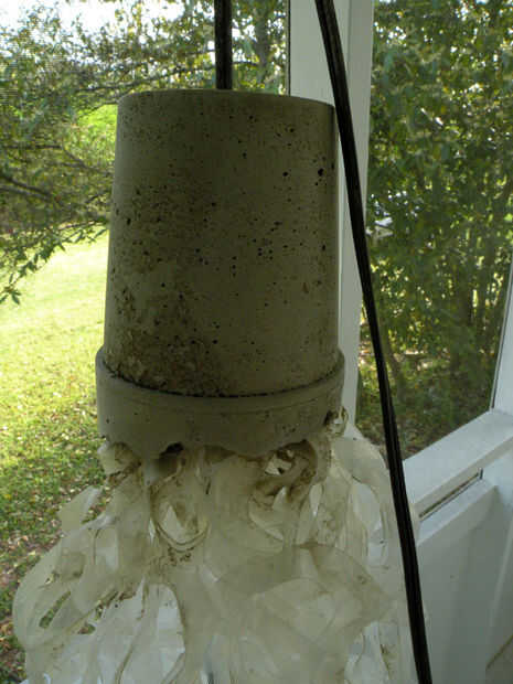 Suspender la lámpara de la misma manera para verter la dona en la parte inferior, pero boca abajo ahora suspendido. Apoyar la taza en el piso. Mezclar algunos concreto pero tamizar las rocas fuera de mezcla primero--una vez que se agrega agua, usted debe terminar con una mezcla fina y suave. Poner un poco de la mezcla en el fondo de la taza, luego rellenar todos los extremos libres de las cadenas de anillos en la taza. Rematar con la mezcla. Permita que cure durante varios días. Romper Copa, colgar y agregue los bulbos.