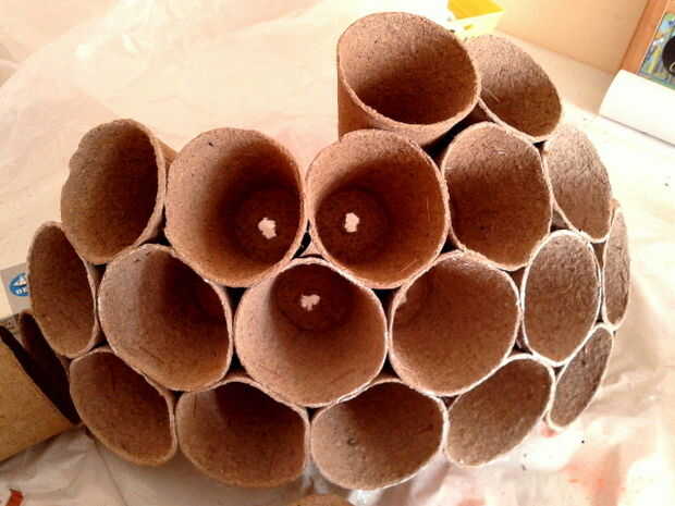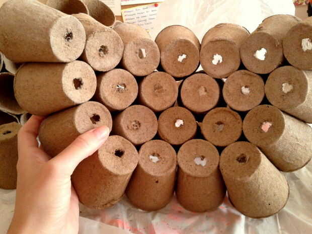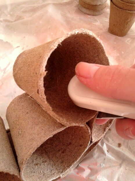 Grapa las macetas de fibra que fueron rociadas según su forma se le había