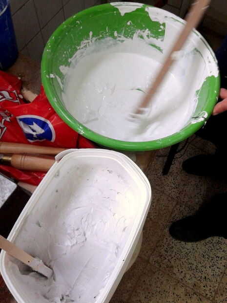 Masilla de mezcla con agua hasta obtener superficie lisa hasta que va a ser batido. Cepillo en