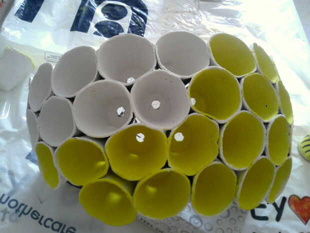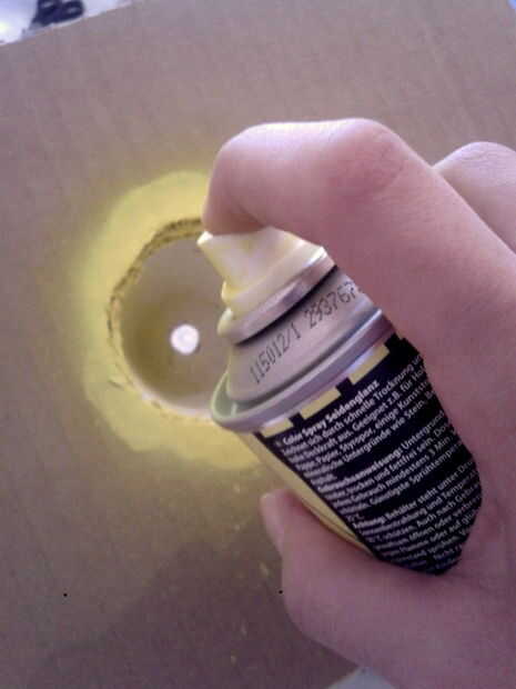 Rocíe la superficie interna de macetas de fibra con pintura en aerosol amarilla. Antes de pulverizar, hacer máscara como una ronda que tiene un radio como radio de macetas de fibra a la cartulina para no rociar la superficie exterior de macetas de fibra. Coloque esta mascarilla sobre fibra potes de spray luego.