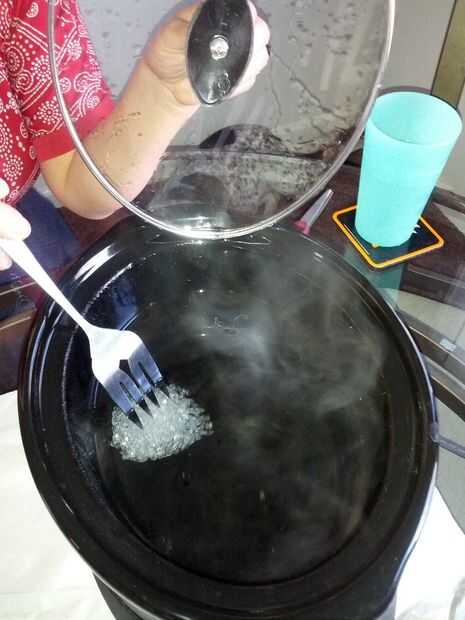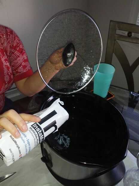 Es muy útil utilizar un crockpot u otra cosa para mantener el agua caliente cuando el Instamorph de moldeo. Uno de los puntos fuertes de Instamorph es que si es un error, simplemente puede lo derretirse e inténtelo de nuevo, sin embargo, esto se hace mucho más difícil si usted tiene que levantarse cada vez que para calentar el agua subir. Una vez que tienes el agua preparado, simplemente Vierta la Instamorph en él. Utilice un tenedor o pinzas para revolver y la Instamorph se adherirá a sí mismo en el agua. El Instamorph se convertirá casi transparente cuando está listo para ser sacado y moldeado. SER cuidado, puede haber agua caliente atrapado entre los gránulos de Instamorph y si se que aprete, el agua caliente puede chorrear hacia fuera en usted!