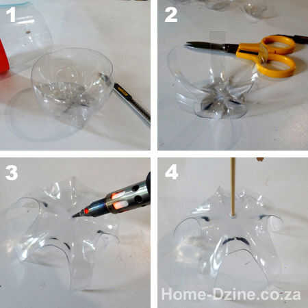 1. Retire los fondos de sus botellas de plástico - en alrededor de 1 cm arriba de la línea que va alrededor de la base. He notado que la mayoría de las botellas tienen esta línea alrededor de la base. Me corte mi base con un cuchillo y luego Sobrehilar para arriba con tijeras.