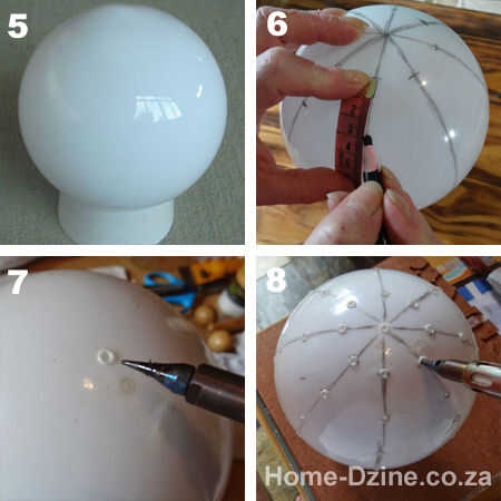 6. trazar líneas de arriba hacia abajo alrededor de la lámpara para dividir en secciones. Tiene 8 secciones en el globo de la lámpara, pero recomendaría que se divide en 16 secciones. Utilice una cinta métrica de costura para marcar cada 2cm de la parte superior de cada línea.