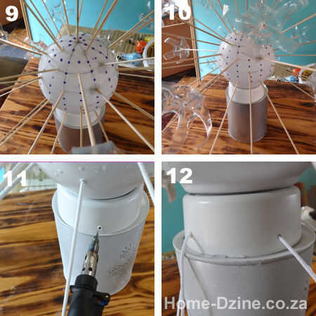 Uso de materiales comunes como Cañitas y tapas de plástico que he desarrollado un sistema modular para lámparas en cualquier rango de tamaño y forma. La base de la lámpara es una simple tapa de plástico cortada con soportes de paja. Una columna está