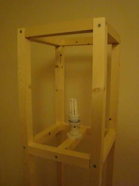 Ahora deberás conectar la toma de luz, cable, interruptor y enchufe.  Exactamente cómo hacerlo varía con diferentes tipos de conexiones, así que no voy a dar instrucciones; Si no has hecho esto antes, consultar con alguien que sabe su manera alrededor de equipos eléctricos de la red.  Coloque el titular luz (y el interruptor, si usted decide usar un interruptor de cordón) a la parte restante del corto de madera y tornillo en la parte inferior de la estructura de sombra.