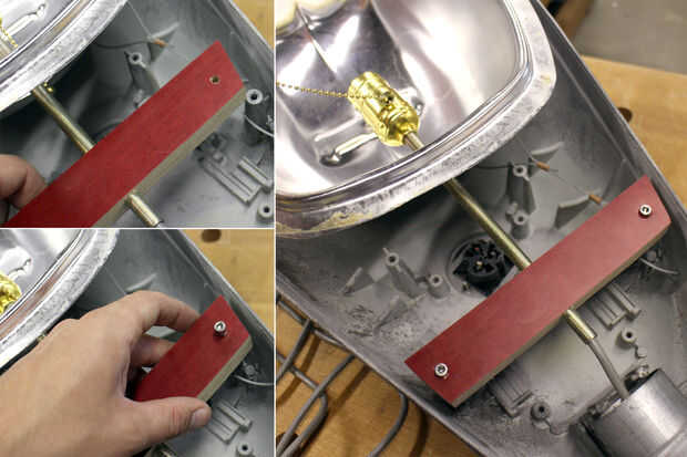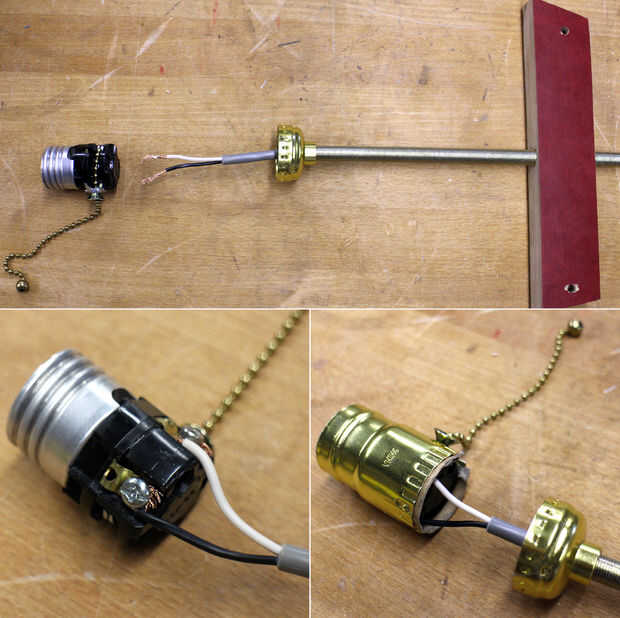 El alambre eléctrico ahora puede ser roscado a través de la entrerrosca hueco y por cable en la toma de luz, después el conector puede ser montado. Todo el conjunto puede entonces montarse dentro de la lámpara y el soporte de madera atornillados en los orificios de montaje.