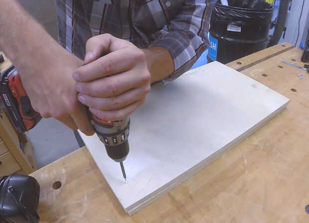 Después, la segunda hoja de madera contrachapada se adjunta a la parte inferior de la primera pieza y asegurada con tornillos. Esta base carnosa fue luego lija para quitar las rebabas y Redondee las esquinas de las.
