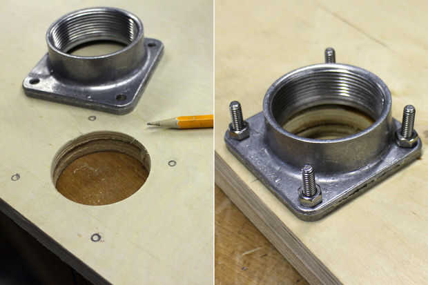 Empecé por el collar de montaje cerca del borde de una de las láminas de posicionamiento y rastreo el interior dan una hoja. También se trazaron los orificios de tornillo en la madera contrachapada.