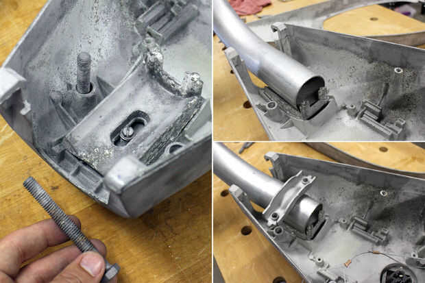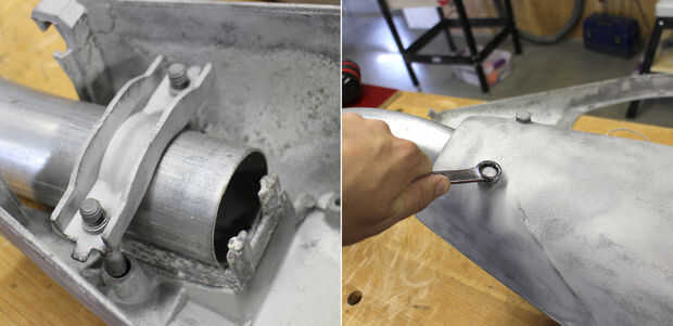 He quitado los dos tornillos, junto con el soporte y dio a todos una buena limpieza con un cepillo de alambre para quitar cualquier residuo. 2" codo EMT fue insertado en la parte posterior de la cabeza de la lámpara, el soporte se instaló en la parte superior del codo y luego los pernos fueron apretados para sostener el codo en su lugar.