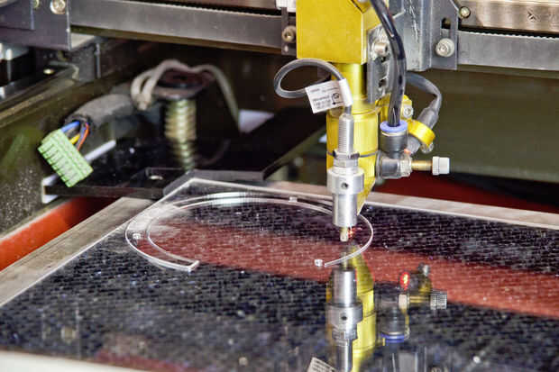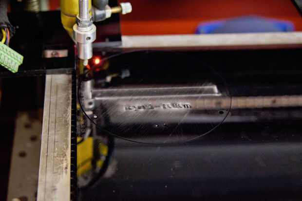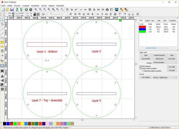 - A continuación, seleccione sólo el contorno exterior circular, establece en 'Comprobar proyecto' [gasolina] y hit Run para determinar de manera no destructiva, que permanecerá a la cabeza del láser dentro de los límites de la hoja de acrílico.