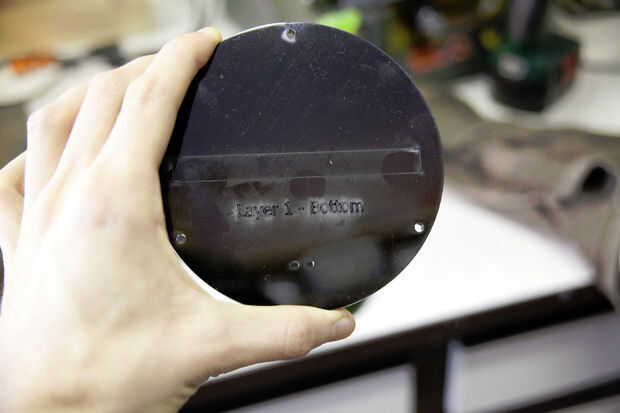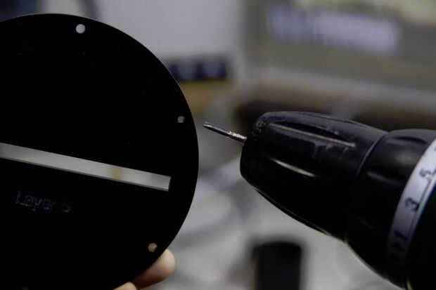 - Con un cajeado pilotado en una máquina de perforación (o un taladro de 7 mm) hacer agujeros cilíndrico contador (de unos 3 mm de profundidad) alrededor de las tres m 3.4 a través de los agujeros en la parte inferior de las capas L1, L3 y L5. Estos traguen completamente las cabezas de los tornillos.