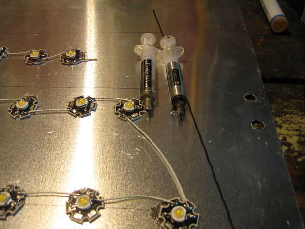 De la soldadura de los leds (ya montados en el PCB Estrella) en serie (- a +) y una térmica epóxico para adherir a un disipador de calor.  Me gusta el epoxi Ártico dos parte pero estoy seguro de que otros se trabajan así.