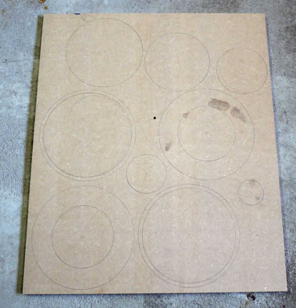 Comience por dibujar un montón de círculos con un compás en un tablero MDF de 12 mm: