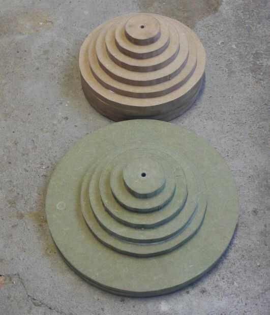 Unir los círculos en el siguiente orden: 5 + 8 + 11 + 14 + 17 + 26 + 26 cm para la pieza inferior y 5 + 8 + 11 + 14 + 17 + 20 + 20 + 20 + 20 cm para la pieza superior.