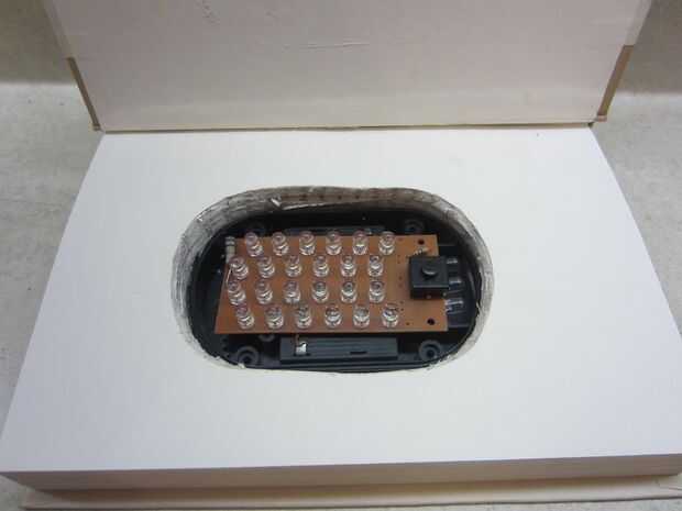 Coloque su lámpara modificada dentro del corte orificio y cierre el libro. Si el libro no cierra completamente el libro es demasiado fina. Si se cierra completamente, puede pegar la luz en el lugar. Asegúrese de que pegue para que los LEDs están mirando hacia el frente del libro.
