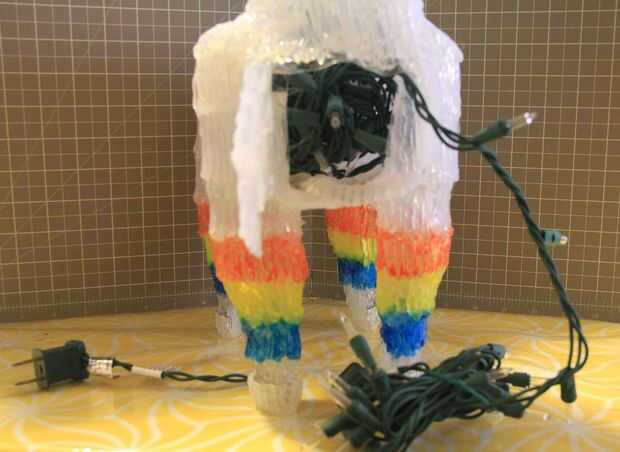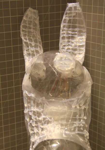 Fije la puerta de la cavidad de pecho y usar cintas como una bisagra en un lado. Use una cuchilla Xacto, cortar una entrada de la botella del cuerpo principal hacia arriba en el área de la cabeza. Tomar sus luces de Navidad y les meter dentro el piñata cabeza/cuerpo, con el cable que sale del orificio correspondiente.