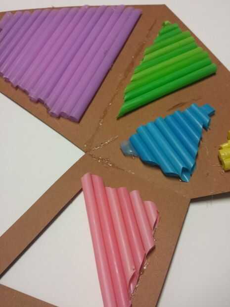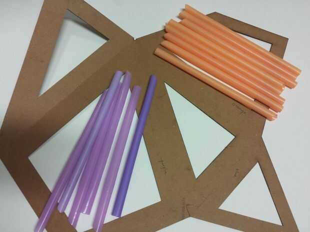 Los paneles de uno en uno, primero decidir qué color usted desea utilizar para cada polígono en el marco de la forma. Coloque el marco boca abajo sobre una superficie plana (el lado anotado debe ser hacia abajo). Fije las pajillas individualmente, cada uno para que cubra el espacio abierto con alrededor de un cuarto de una pulgada extra a cada lado del corte. Usando pegamento caliente en cada lado, fije firmemente cada paja al marco.