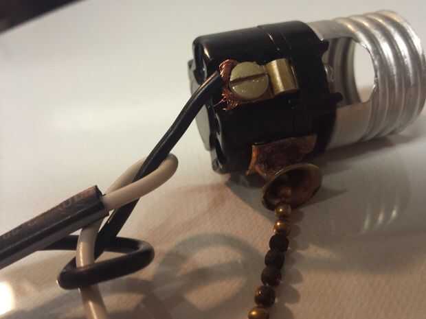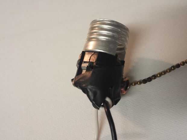 Tome el extremo del cable con el alambre expuesto y corte cuidadosamente entre los dos alambres de metal, cerca de cinco pulgadas, que están separados los alambres individualmente aislados. Nudo de un electricista y exponer aproximadamente una pulgada en el extremo de cada cable. Usando alicates y un destornillador, envuelva cada cable en el tornillo apropiado en la toma de corriente y apriete los tornillos. Una vez que ambos cables están conectados a la toma, apriete el nudo cerca de la toma de corriente y cubrir el fondo entero de encaje con cinta aislante. Enroscar la bombilla.