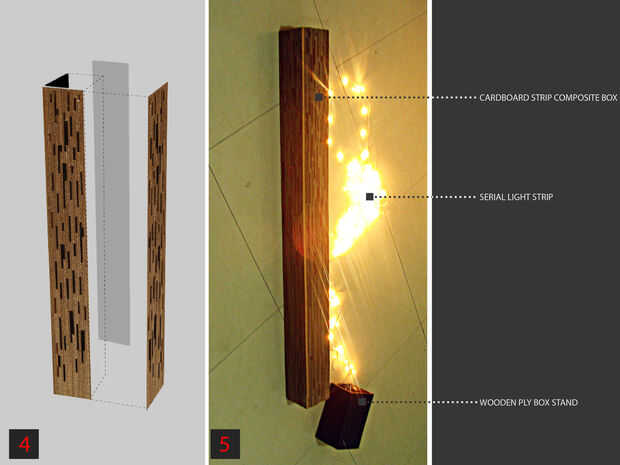 5. el componente principal de la lámpara a. utiliza caja compuesto de tiras de cartón. b. una luz serial c. madera capas caja para sostener el cuadro de la tira de cartón, pintados al color deseado.