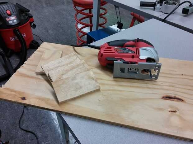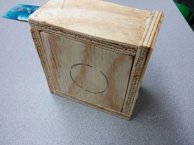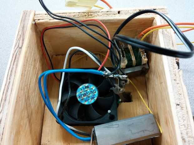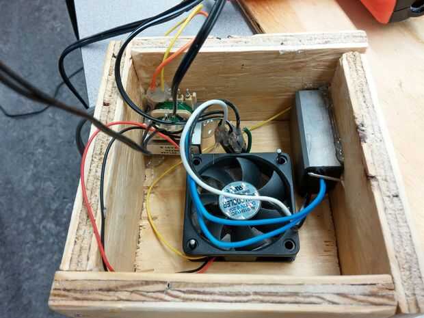 Estas piezas fueron gorila pegados y clavados juntos. La parte superior e inferior encaja perfectamente y fueron aprovechados en su lugar por un martillo. Los transformadores fueron pegados en su lugar con caliente pegamento en los bordes. El ventilador fue clavado sobre el agujero de la parte inferior para facilitar la salida del aire caliente generado por la bombilla halógena.