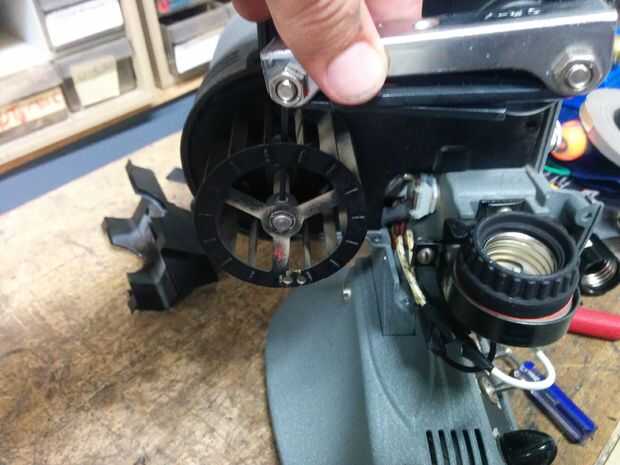 En este punto tenemos una lámpara dentro del proyector que se acciona desde el interruptor de "Lámpara", sin embargo nuestro 7 Watts no podrán lucir muy bien a través del agujero de 8mm. Para esto de que tuve que quitar la mayoría de los materiales de la lente de la parte delantera del proyector así como apoyo el obturador la curación. Los materiales de la lente se todos celebraron con pequeño cabeza plana tornillos y vino aparte rápidamente y fácilmente. Tomé fotos de cada paso de lo que tuve que quitar. La única parte que no podría ser tirada con la cabeza plana del ventilador que tenía un grub tornillo que tuvo una muy pequeña llave hexagonal.