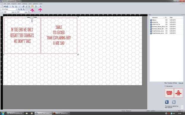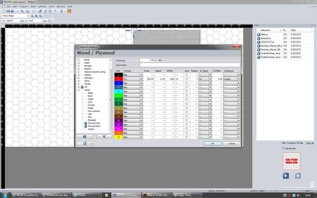 Trotec JobControl met snijd je het ontwerp. Sube imágenes de het bestand. (staat als goed al aan de rechterkant) Dan sueño je het bestand en het vak. Klik dan op het rechter vakje material plantillas (zie afbeelding). Dan krijg je de instellingen. Selecteer het y. Mij voor madera contrachapada. rood en bij de kleur. Zie de instellingen en de afbeelding.